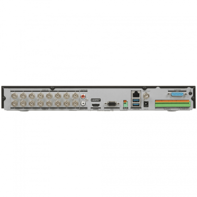 16‑канальный гибридный HD‑TVI‑регистратор с поддержкой распознавания лиц и технологией AoC (аудио по коаксиальному кабелю). Совместим с аналоговыми камерами, а также с HD‑TVI, AHD и CVI‑камерами. Дополнительно поддерживает подключение IP‑камер.