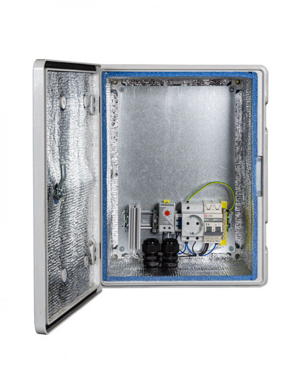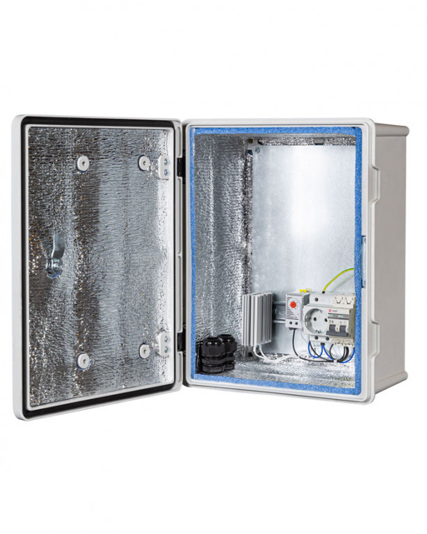 Шкаф представляет собой конструкцию, состоящую из корпуса и дверцы. Корпус и дверца изготовлены из технологичного SMC-композита методом штамповки на гидравлическом прессе. Утепление шкафа выполнено из Порилекса толщиной 10 мм. Внутри корпуса установлена монтажная панель со смонтированными компонентами системы поддержания температуры, обеспечивающей безопасную работу размещенного в нём оборудования при температуре окружающего воздуха от -55°С до +50°С.
