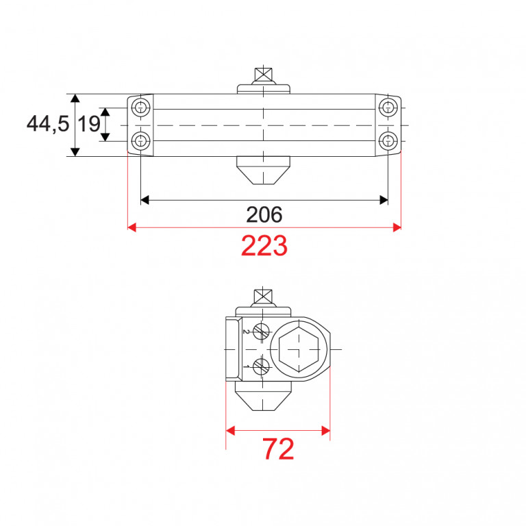 Класс доводчика: EN6; Вес двери: не менее 100 кг, не более 150 кг; Ширина двери: не более 1400 мм; Угол открывания двери: до 180°; Тип установки: универсальный; Габариты: 42.5×248×72 мм; Посадочные размеры: 230×19 мм; Материал: алюминий; Рабочая температура: от -45° до 60°С