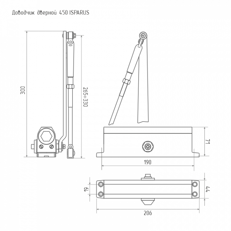 Тип изделия: Доводчик дверной; Скорость закрывания регулируется двумя независимыми клапанами: Да; Класс доводчика: EN6-7; Материал: Силумин; Материал корпуса: Силумин; Морозостойкость: Да; Температурный режим, С: от -45 °С до +60 °С; Крепеж в комплекте: 2 вида крепежа - для металлических и для деревянных/пластиковых дверей; Длина, мм: 208; Ширина, мм: 45; Форма отверстия рычага: Звезда; Фурнитура для ПВХ и алюминия: Да; Сертификат ГОСТ: Сертифика...т соответствия ГОСТ Р 56177-2014; Фиксация положения (hold open): Нет; Ресурс работы: Не менее 500 000 рабочих циклов; Производство: НОРА-М Isparus.