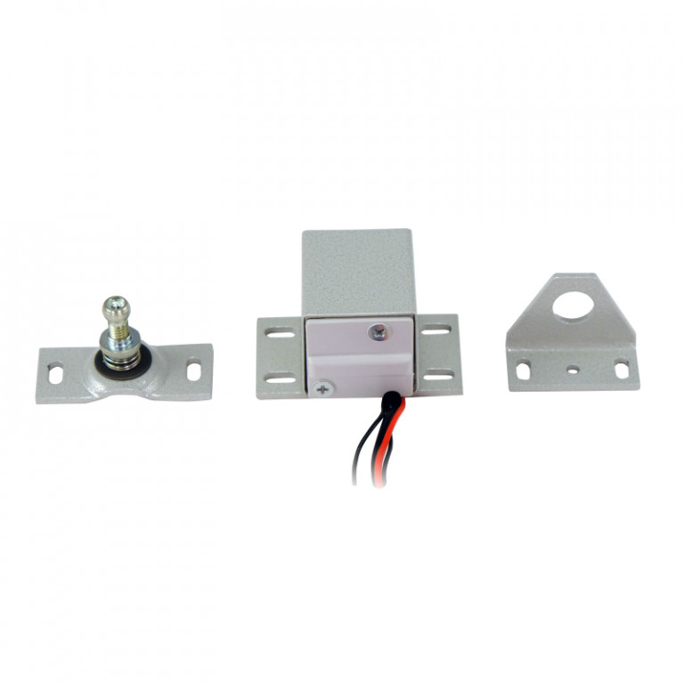 Promix-SM102 накладной универсальный миниатюрный электромеханический замок (Шериф-2 лайт НО 12 В). Четыре варианта крепления замка, два ригеля в комплекте. Встроенный датчик положения двери. Сила удержания ригеля 300 кг, 26,5х27х31,5 мм. Нормально открытый, напряжение питания 12 В/0,1 А, датчик положения двери, цвет - серебро.