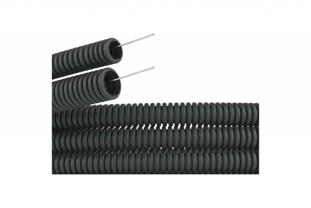 Лёгкая гофрированная труба из полиэтилена низкого давления (ПНД) с протяжкой для прокладки электрических, телевизионных и компьютерных кабелей. Чёрный цвет и эргономичная конструкция упрощают монтаж и идентификацию линий.